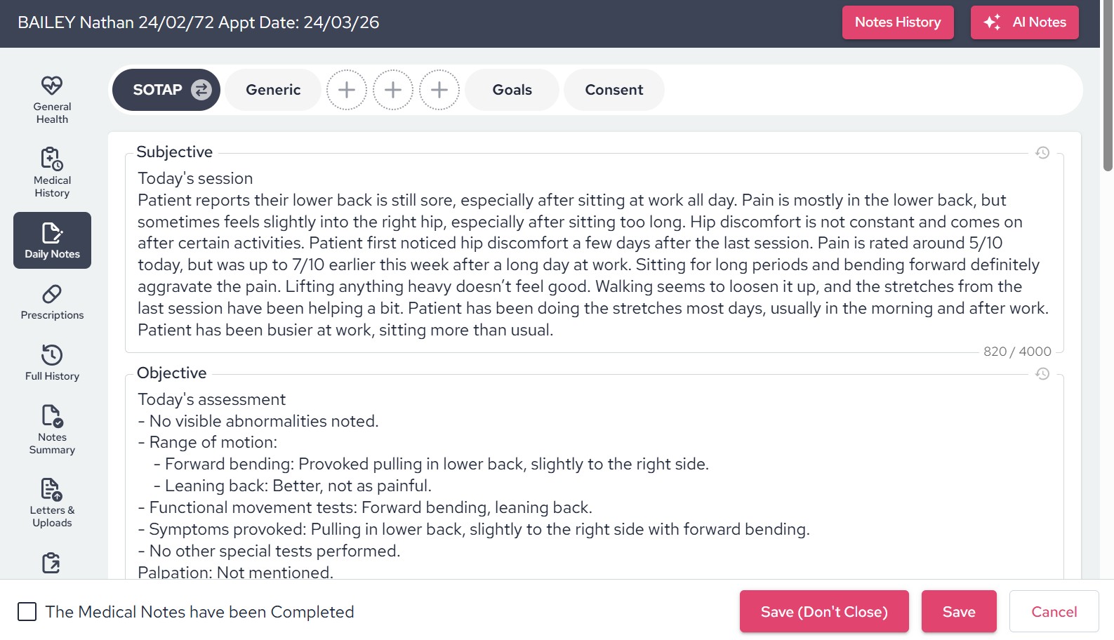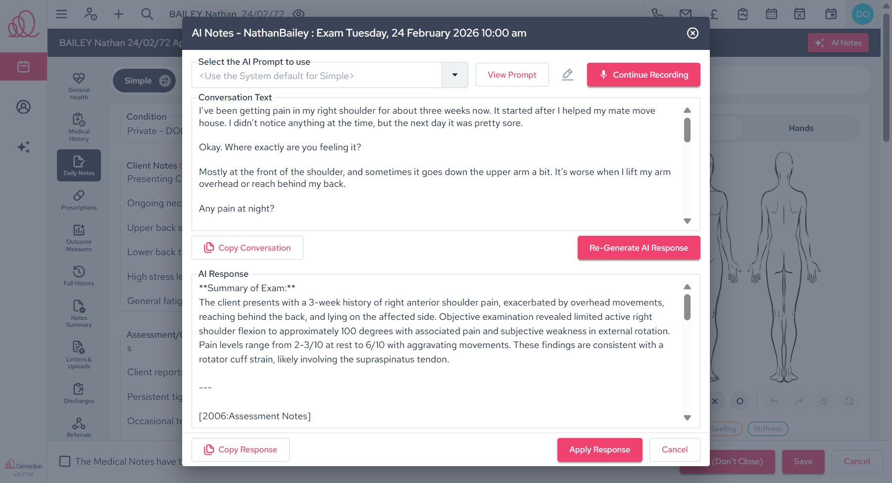 Because Gensolve AI is built into Practice Manager, it knows your forms. It intelligently maps the conversation directly into the correct fields of your exam templates (Subjective, Objective, Analysis, Plan, etc.).