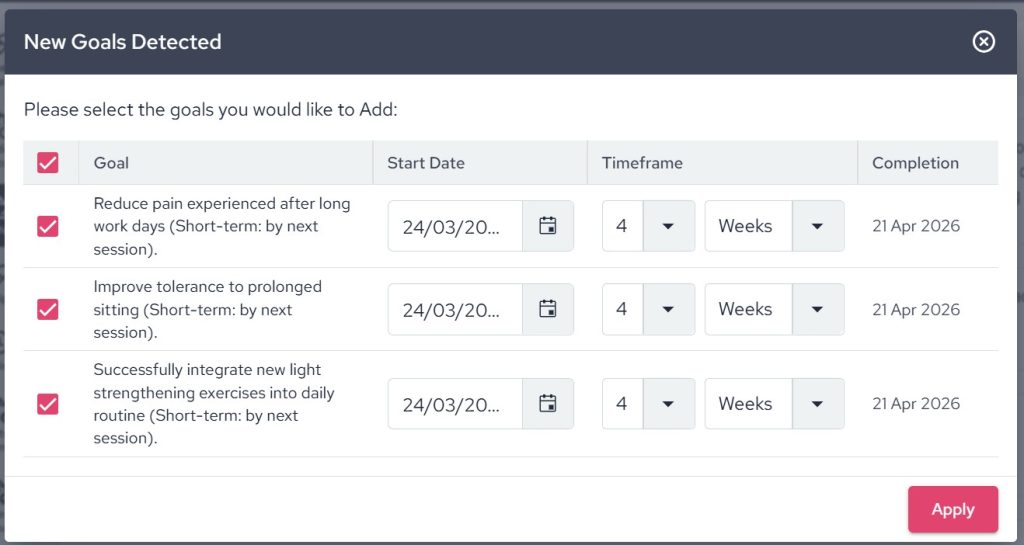 Goals can also be detected and completed directly within the system, making it easy to track progress and keep treatment plans up to date without additional admin.