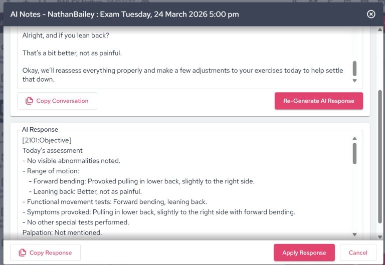 Turn a natural conversation into a polished, professional medical record in seconds. Using Custom AI Prompts, you control the tone, spelling conventions, and structure of the output. The AI organises the transcript into your standard exam formats (like SOAPER or Rehab Notes) automatically.